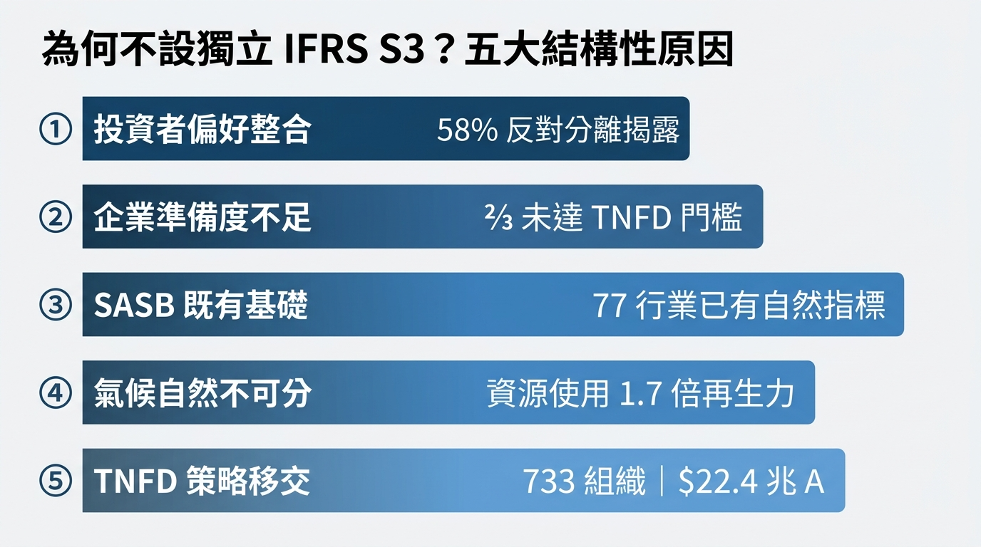 因為 58% 機構投資者反對分離揭露、SASB 已有 77 行業自然指標、TNFD 正移交技術工作、氣候與自然科學上不可分。ISSB自然揭露選擇在 IFRS S1 上疊加增量要求,兼顧效率與涵蓋度。
