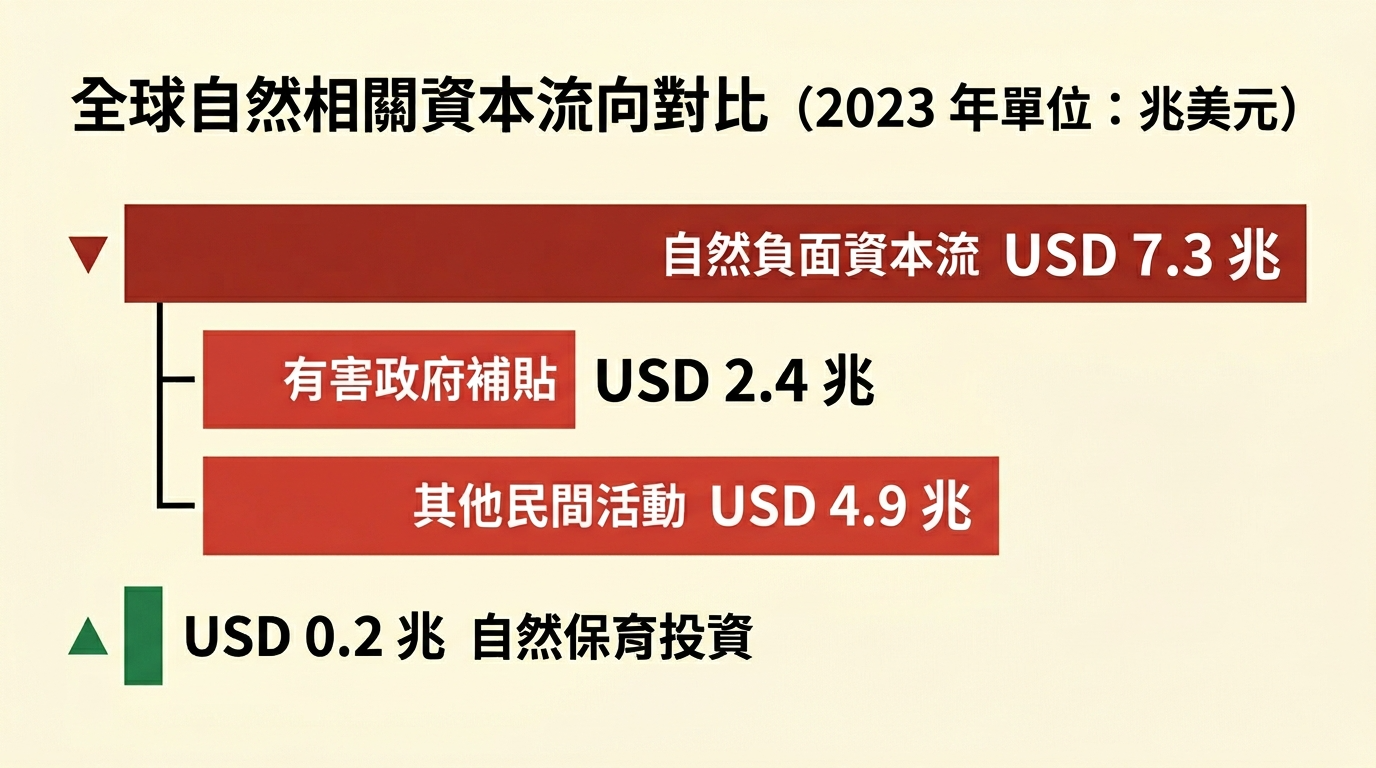 每投入 1 美元保護自然,同時有 30 美元在摧毀它。UNEP《State of Finance for Nature 2026》指出 2023 年全球 7.3 兆美元流向自然負面活動,其中 2.4 兆來自有害政府補貼。保育資金僅約 2,000–2,500 億美元,缺口超過 7 兆。