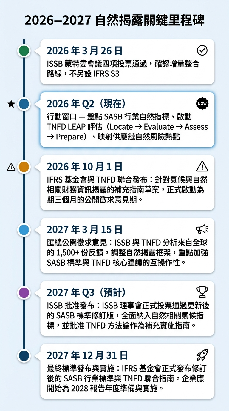 2026/7/24 SASB 意見截止;10 月 COP17 發布徵求意見稿;12/30 EUDR 施行;2027 年起 IFRS S1 第二年須納入自然資訊。企業現在應啟動準備。