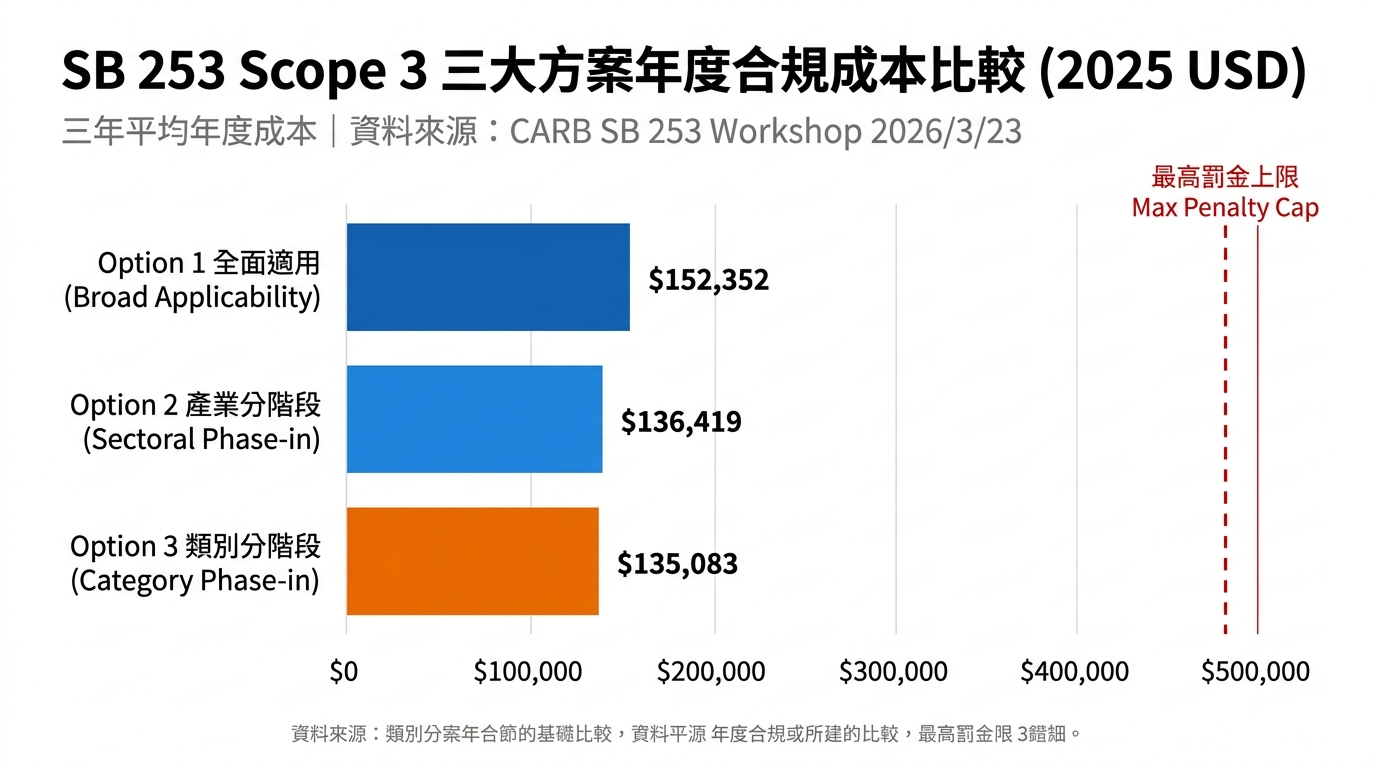 資料來源:CARB SB 253 公開研討會簡報(2026/3/23)|成本以加州消費者物價指數調整至 2025 年美元